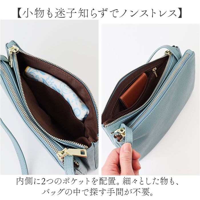 ・2つのポシェットが、1つになったような構造。中央にもポケット付きで、仕分けも簡単。
