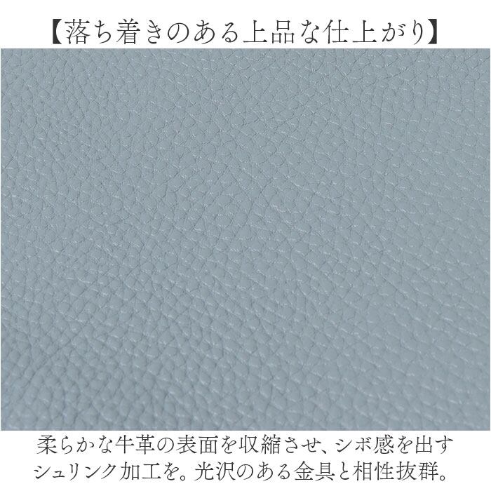 ・柔らかな牛革の表面を収縮させ、シボ感を出すシュリンク加工を。光沢のある金具と相性抜群。
