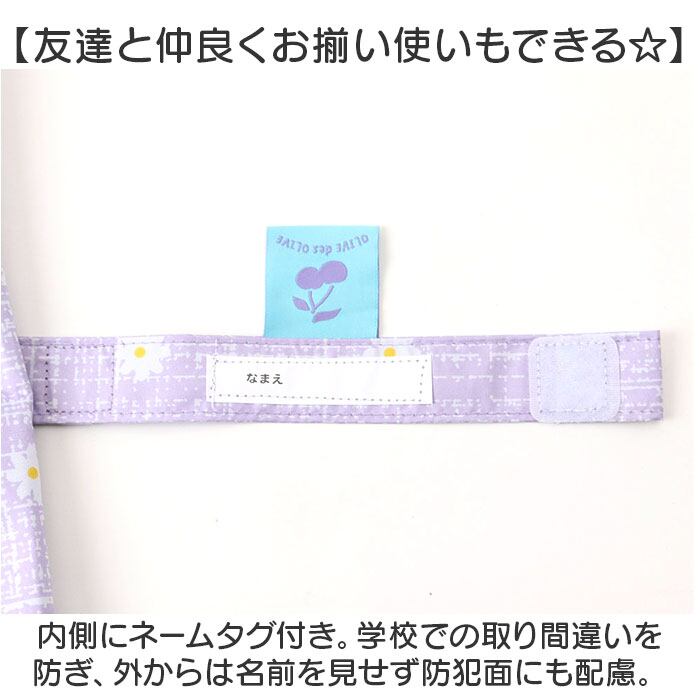 ・内側にネームタグ付き。学校での取り間違いを防ぎ、外からは名前を見せず防犯面にも配慮。