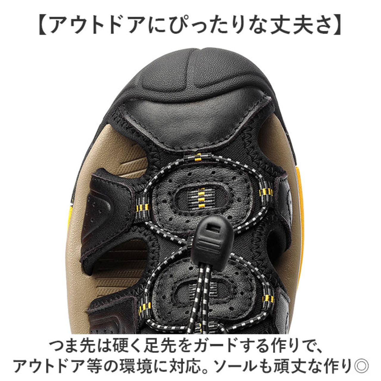 ・つま先は硬く足先をガードする作りで、アウトドア等の環境に対応。ソールも頑丈な作り◎