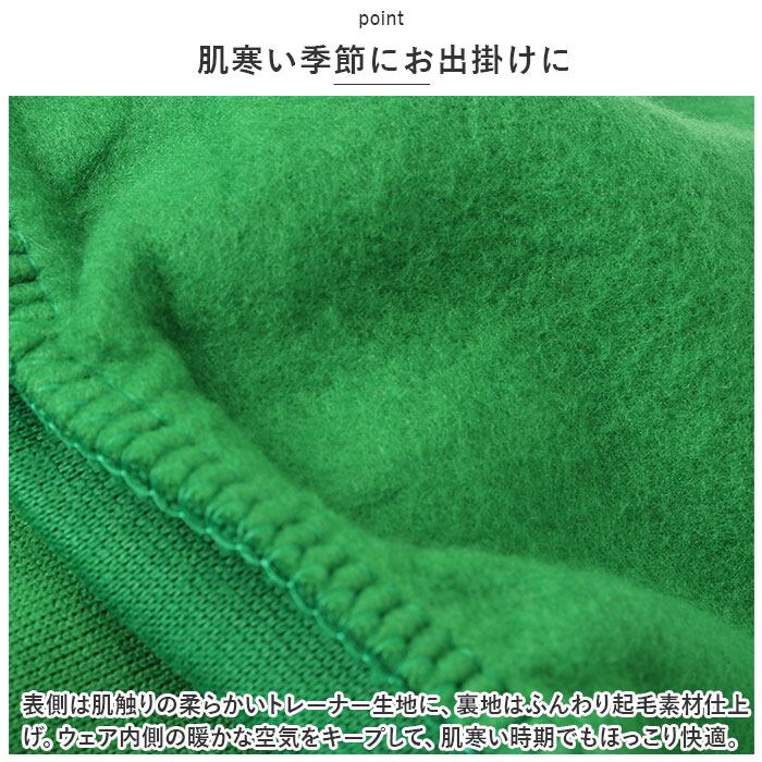 ・表側は肌触りの柔らかいトレーナー生地に、裏地はふんわり起毛素材仕上げ。ウェア内側の暖かな空気をキープして、肌寒い時期でもほっこり快適。