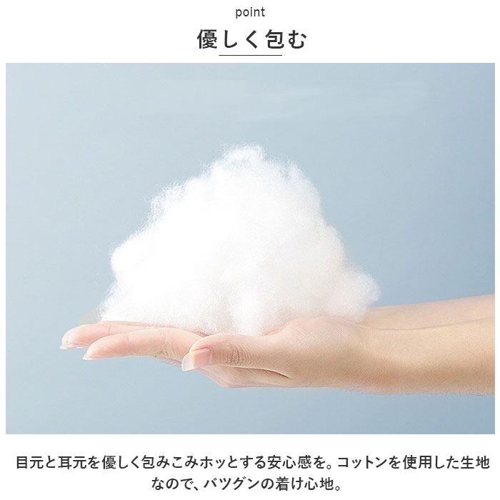・目元と耳元を優しく包みこみホッとする安心感を。コットンを使用した生地なので、バツグンの着け心地。
