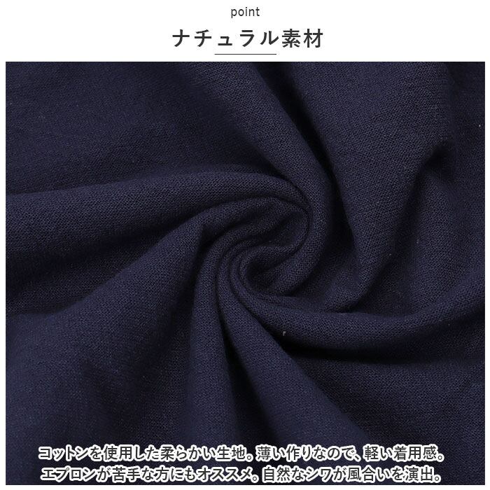 ・コットンを使用した柔らかい生地。薄い作りなので、軽い着用感。エプロンが苦手な方にもオススメ。自然なシワが風合いを演出。