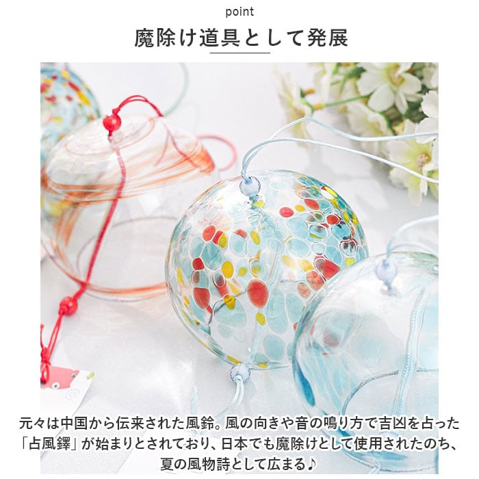 ・元々は中国から伝来された風鈴。風の向きや音の鳴り方で吉凶を占った「占風鐸」が始まりとされており、日本でも魔除けとして使用されたのち、夏の風物詩として広まる♪