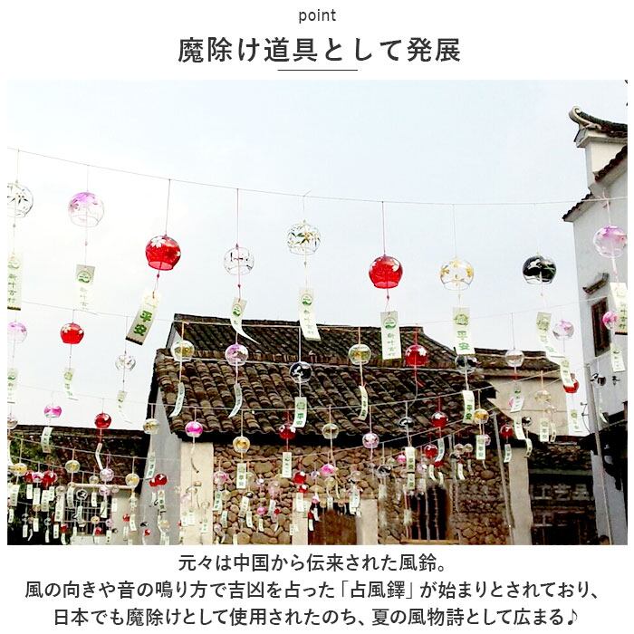 ・元々は中国から伝来された風鈴。風の向きや音の鳴り方で吉凶を占った「占風鐸」が始まりとされており、日本でも魔除けとして使用されたのち、夏の風物詩として広まる♪