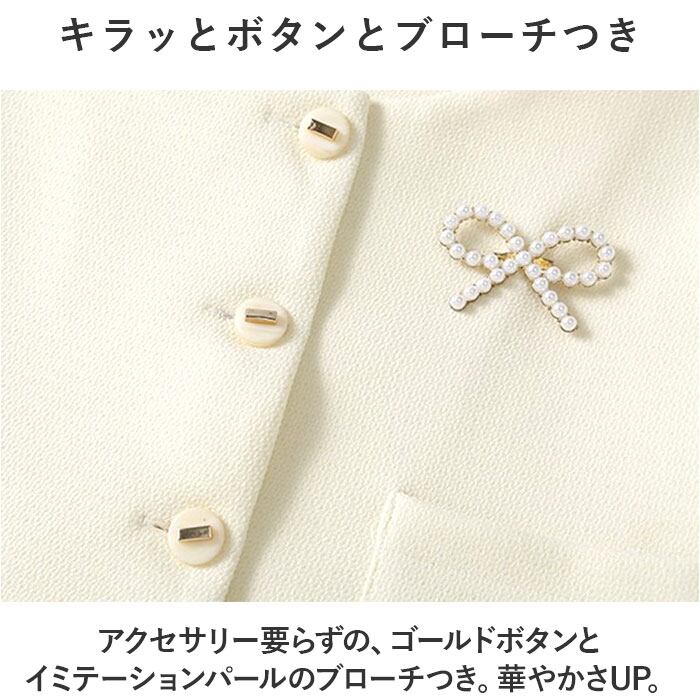 ・アクセサリー要らずの、ゴールドボタンとイミテーションパールのブローチつき。華やかさUP。