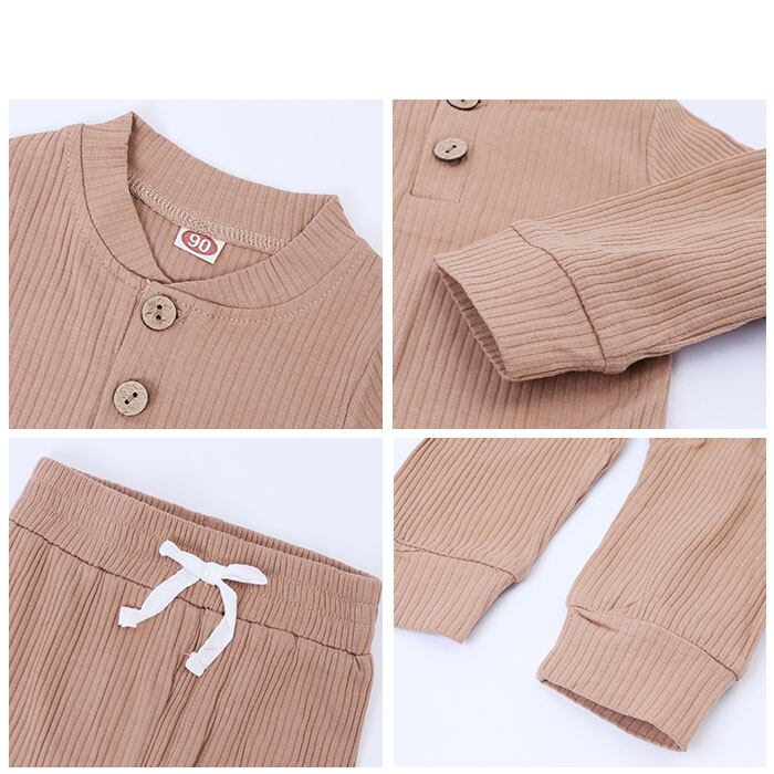 ・ロンパースは首元のボタン&股部分のスナップボタン、パンツはウエストゴム仕様でサッと着脱OK。着替えもおむつ替えもスムーズ。(※パンツのウエスト紐は飾りです。)