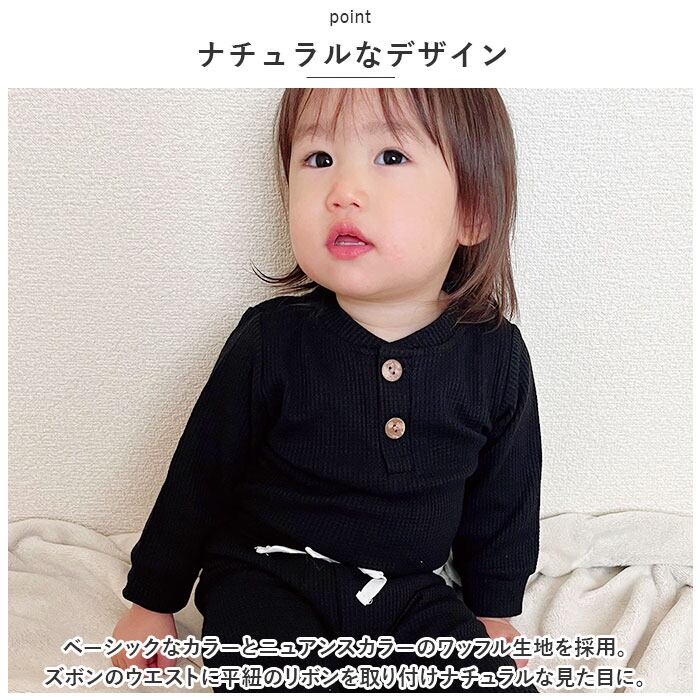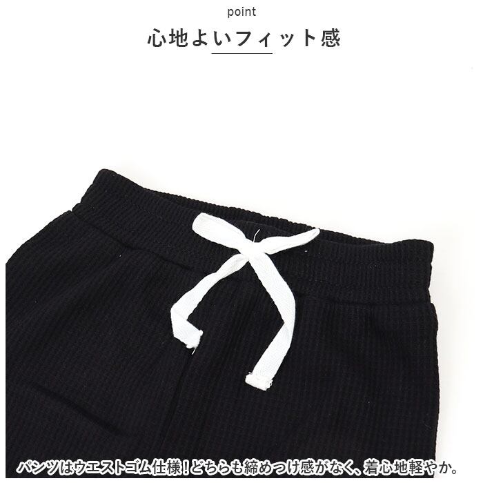 ・ベーシックなカラーとニュアンスカラーのワッフル生地を採用。ズボンのウエストに平紐のリボンを取り付けナチュラルな見た目に。