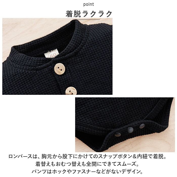 ・ロンパースは、胸元から股下にかけてのスナップボタン&内紐で着脱。着替えもおむつ替えも全開にできてスムーズ。パンツはホックやファスナーなどがないデザイン。