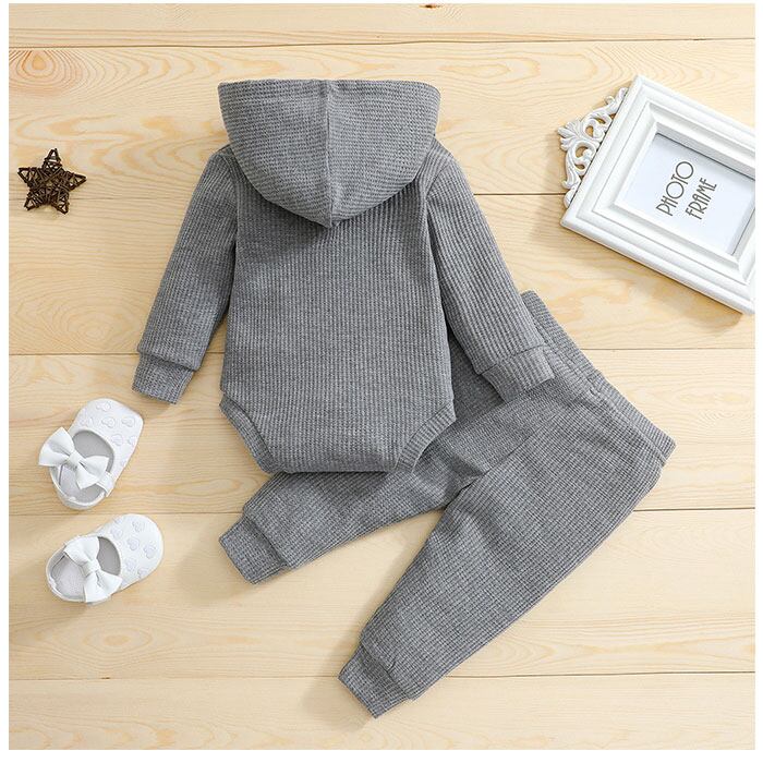 ・フード付きの長袖ロンパースとロングパンツのセット。肌寒い日は、体を優しく包み込むロンパースにパンツをプラス☆