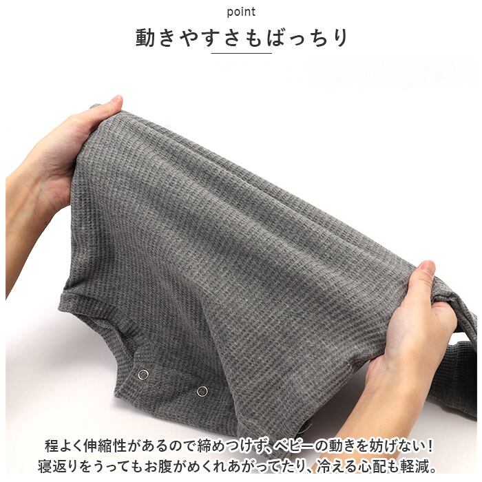 ・程よく伸縮性があるので締めつけず、ベビーの動きを妨げない!寝返りをうってもお腹がめくれあがってたり、冷える心配も軽減。