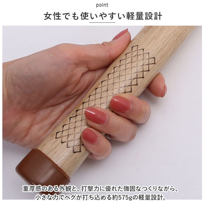 ・重厚感のある外観と、打撃力に優れた強固なつくりながら、小さな力でペグが打ち込める約575gの軽量設計。