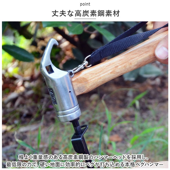 ・程よく重量感のある高炭素鋼製のハンマーヘッドを採用し、最低限の力で、硬い地面に効率的にペグが打ち込める本格ペグハンマー。