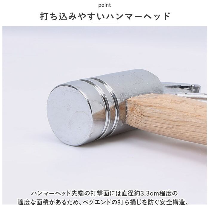 ・ハンマーヘッド先端の打撃面には直径約3.3cm程度の適度な面積があるため、ペグエンドの打ち損じを防ぐ安全構造。