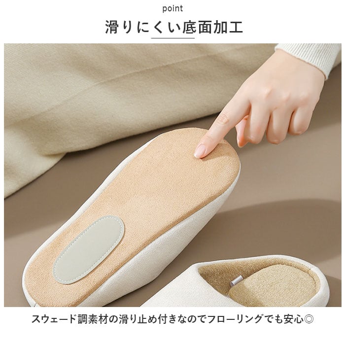 ・ソール裏面は滑らかなポリエステルスエードで仕上げ、フローリングの上を忙しく歩き回ってもパタパタ音が気にならない静音設計。