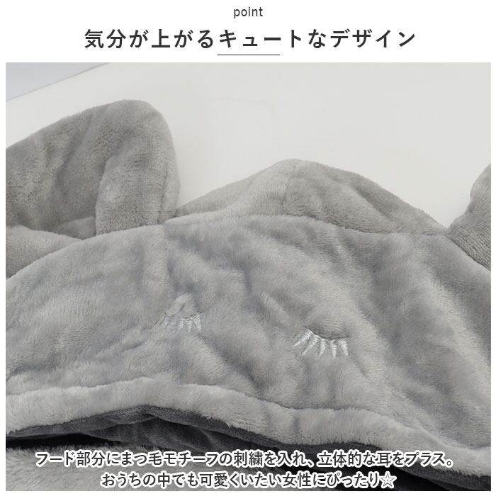 ・フード部分にまつ毛モチーフの刺繍を入れ、立体的な耳をプラス。おうちの中でも可愛くいたい女性にぴったり☆