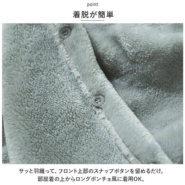 ・サッと羽織って、フロント上部のスナップボタンを留めるだけ。部屋着の上からロングポンチョ風に着用OK。