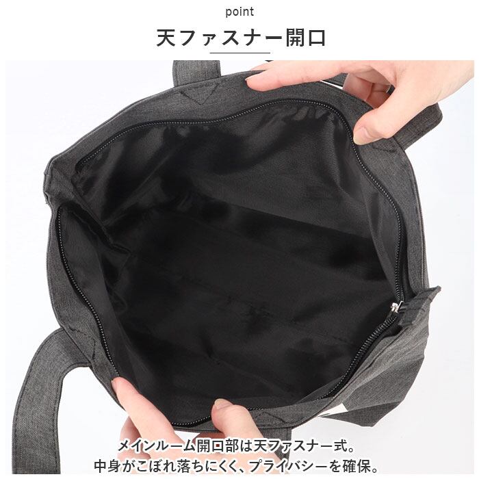 ・メインルーム開口部は天ファスナー式。中身がこぼれ落ちにくく、プライバシーを確保。