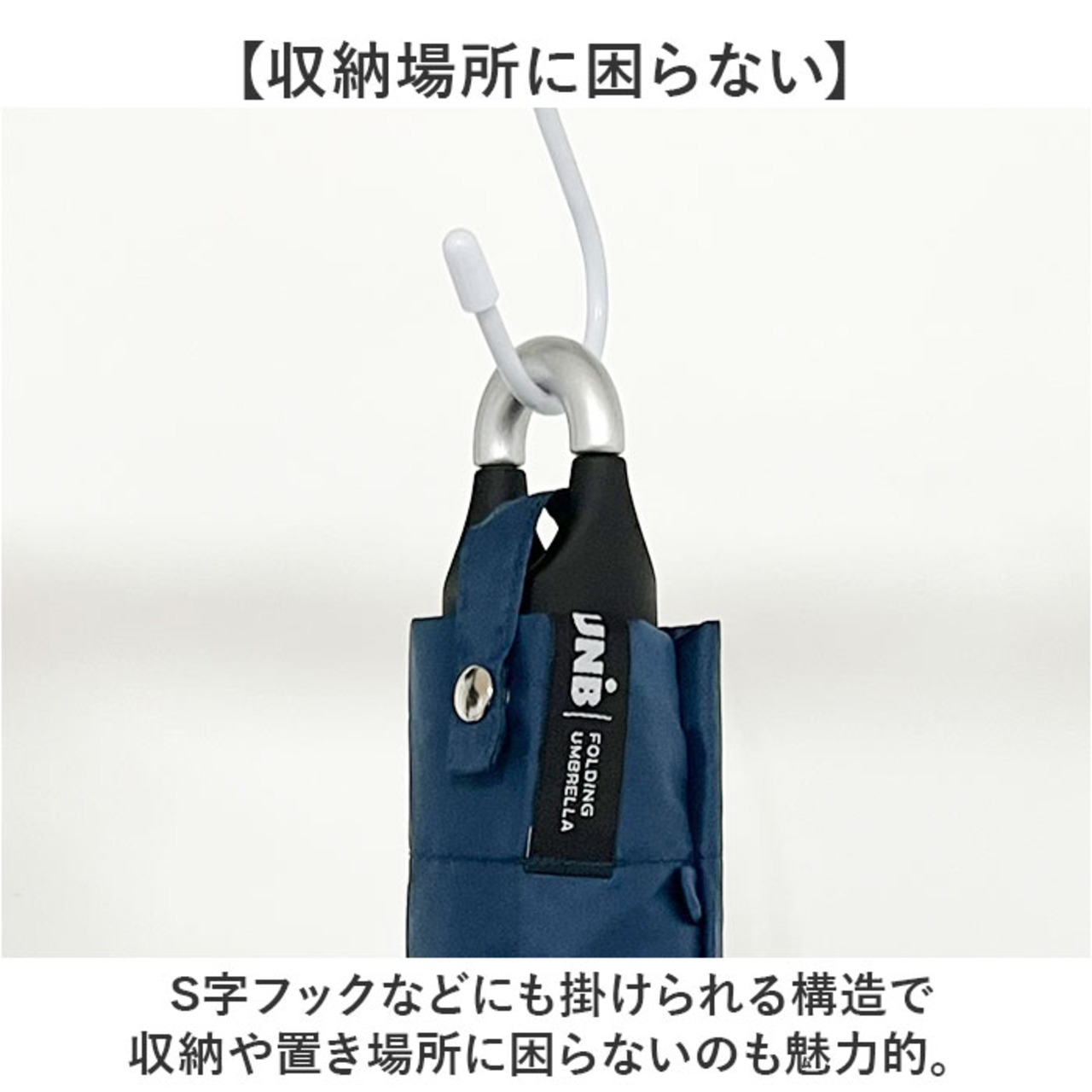 ・S字フックなどにも掛けられる構造で収納や置き場所に困らないのも魅力的。