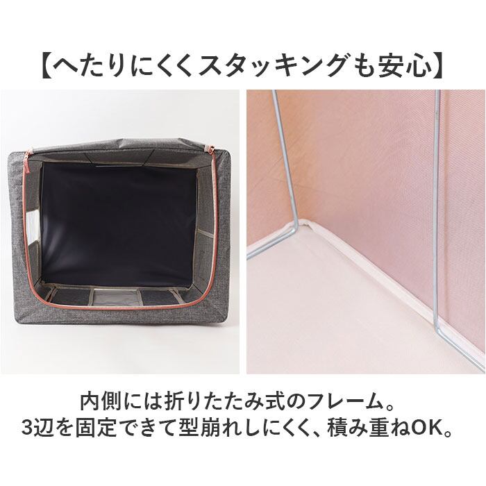 ・内側には折りたたみ式のフレーム。3辺を固定できて型崩れしにくく、積み重ねOK。