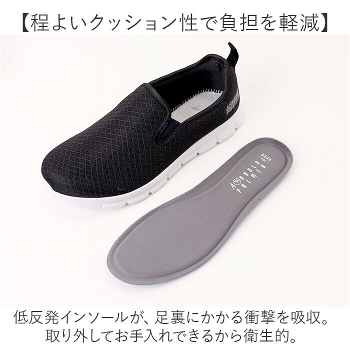 ・低反発インソールが、足裏にかかる衝撃を吸収。取り外してお手入れできるから衛生的。