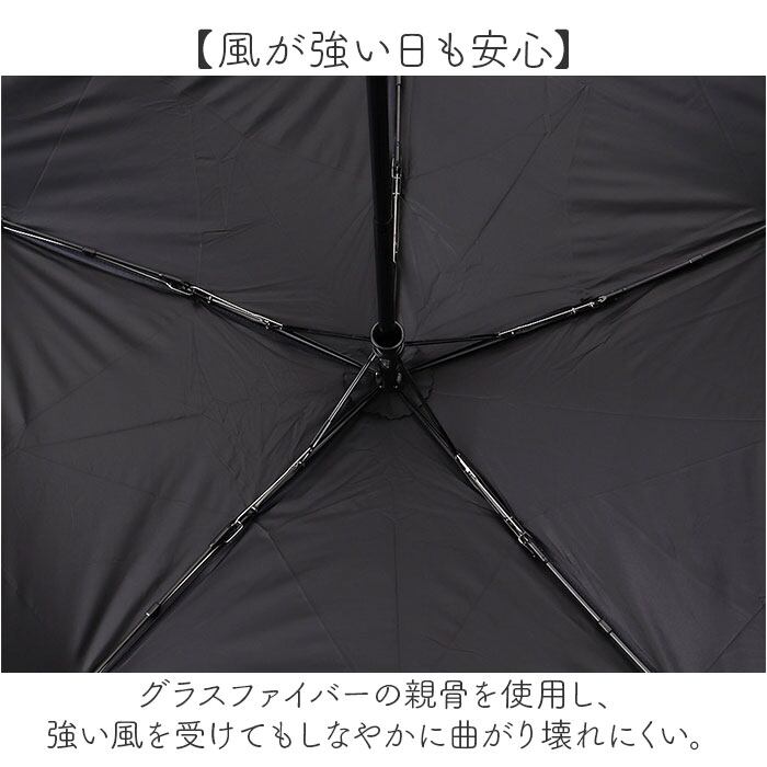 ・グラスファイバーの親骨を使用し、強い風を受けてもしなやかに曲がり壊れにくい。