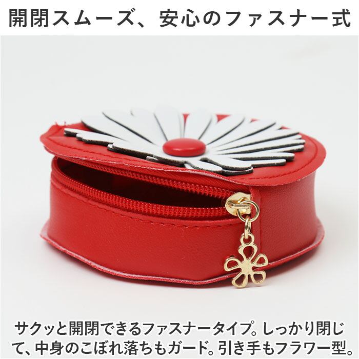 ・サクッと開閉できるファスナータイプ。しっかり閉じて、中身のこぼれ落ちもガード。引き手もフラワー型。