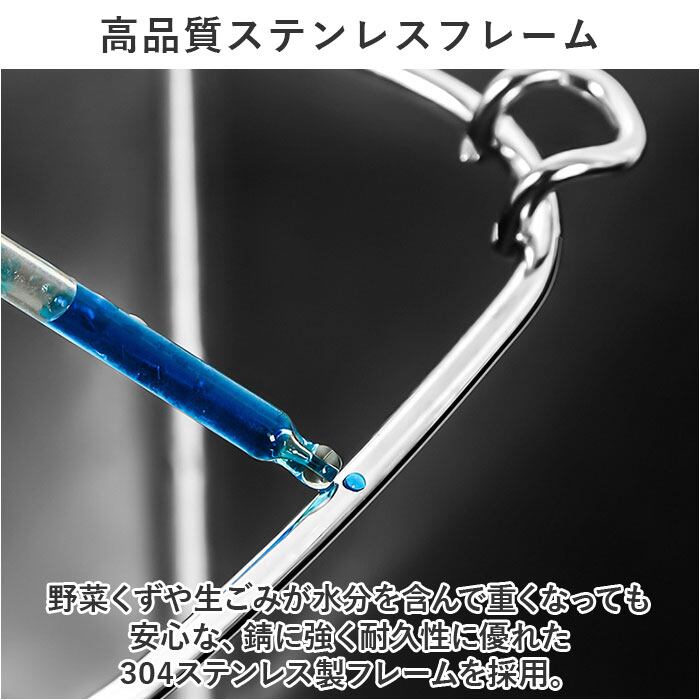 ・野菜くずや生ごみが水分を含んで重くなっても安心な、錆に強く耐久性に優れた304ステンレス製フレームを採用。