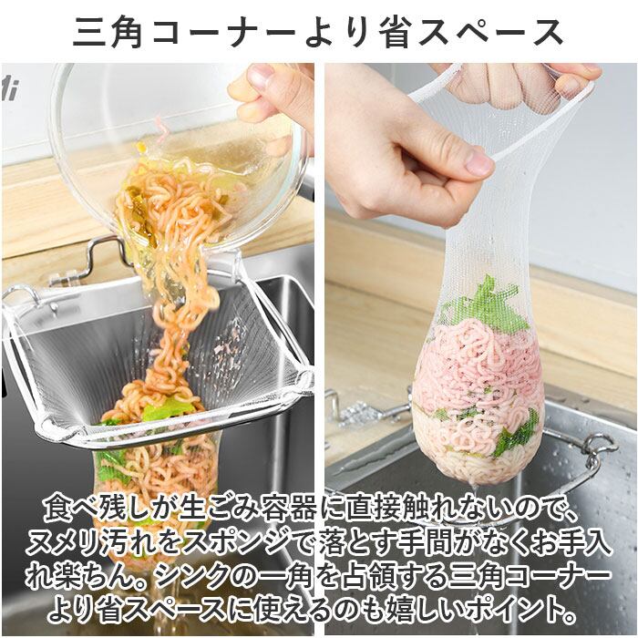 ・食べ残しが生ごみ容器に直接触れないので、ヌメリ汚れをスポンジで落とす手間がなくお手入れ楽ちん。シンクの一角を占領する三角コーナーより省スペースに使えるのも嬉しいポイント。