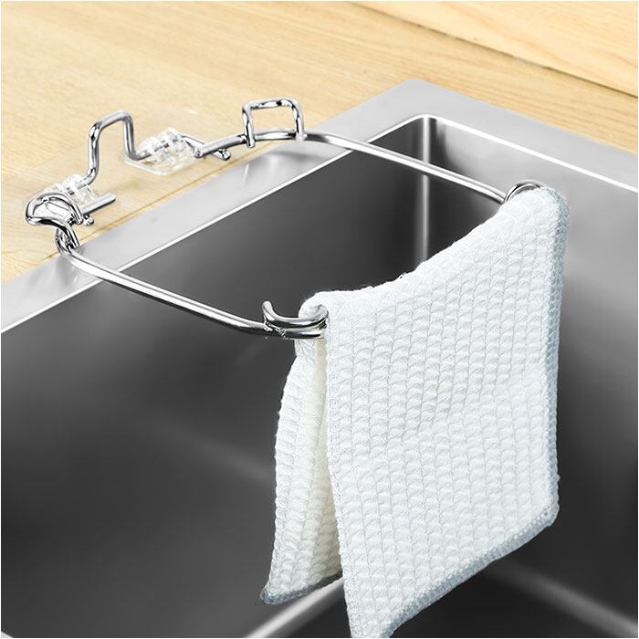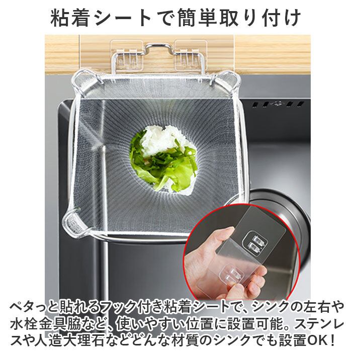 ・ペタっと貼れるフック付き粘着シートで、シンクの左右や水栓金具脇など、使いやすい位置に設置可能。ステンレスや人造大理石などどんな材質のシンクでも設置OK!
