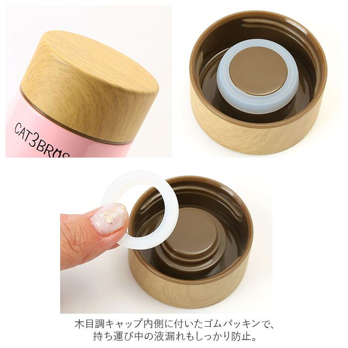 ・木目調キャップ内側に付いたゴムパッキンで、持ち運び中の液漏れもしっかり防止。