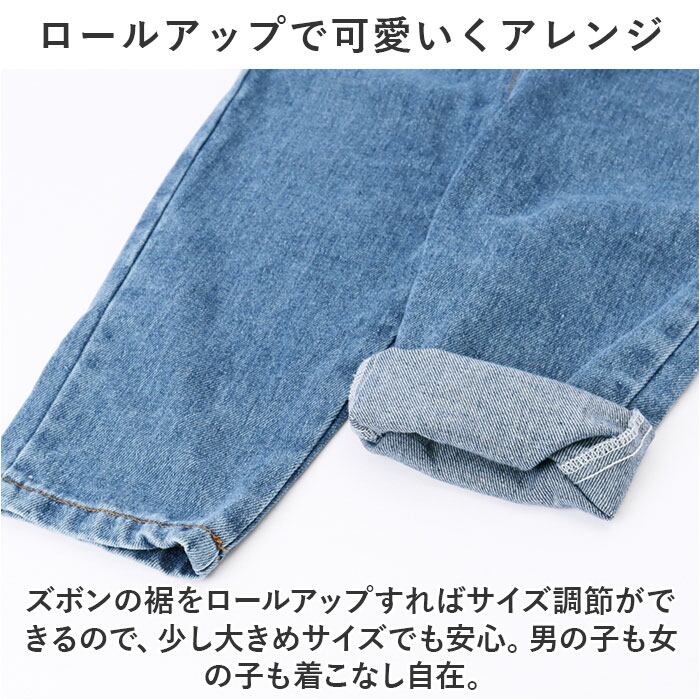 ・ズボンの裾をロールアップすればサイズ調節ができるので、少し大きめサイズでも安心。男の子も女の子も着こなし自在。