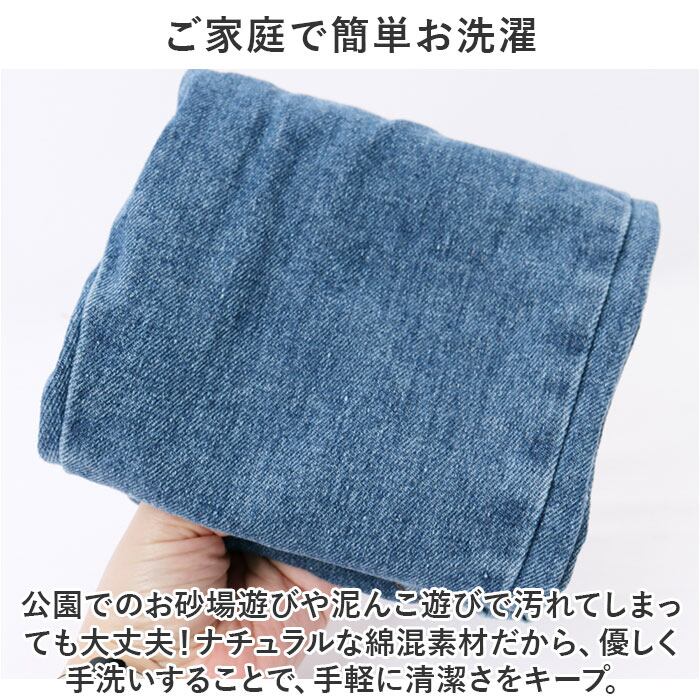 ・公園でのお砂場遊びや泥んこ遊びで汚れてしまっても大丈夫!ナチュラルな綿混素材だから、優しく手洗いすることで、手軽に清潔さをキープ。