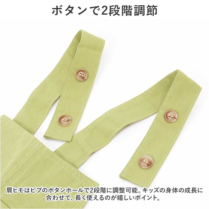 ・肩ヒモはビブのボタンホールで2段階に調整可能。キッズの身体の成長に合わせて、長く使えるのが嬉しいポイント。