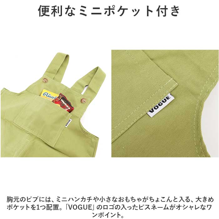 ・胸元のビブには、ミニハンカチや小さなおもちゃがちょこんと入る、大きめポケットを1つ配置。「VOGUE」のロゴの入ったピスネームがオシャレなワンポイント。