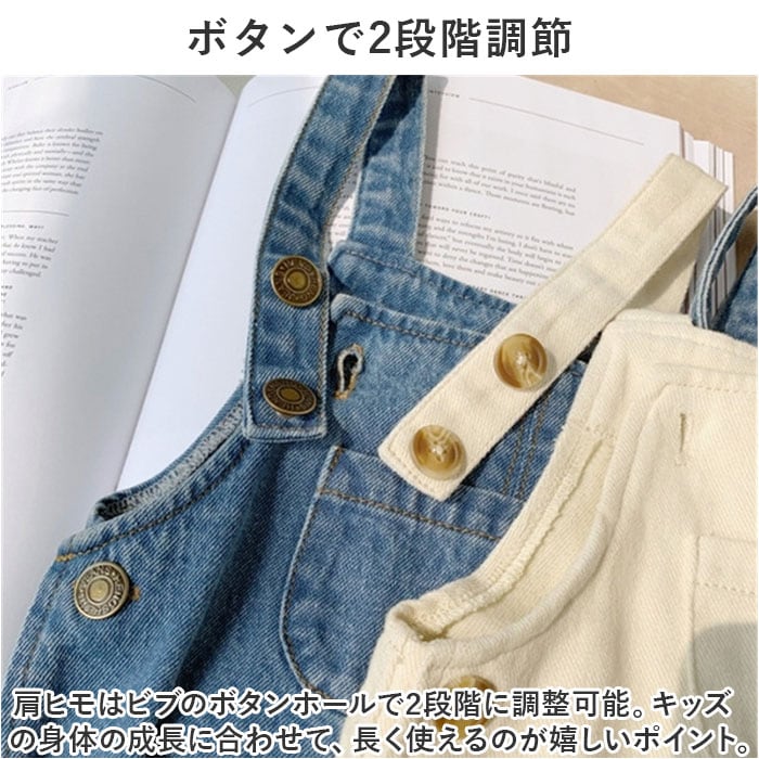 ・くったりと柔らかなデニム素材だから、キッズの身体に優しいゆったりとした着心地◎ビブの両脇に設けた2つのボタンで身幅調節もOK!