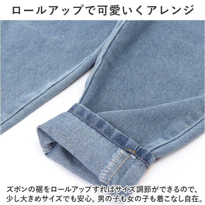 ・ズボンの裾をロールアップすればサイズ調節ができるので、少し大きめサイズでも安心。男の子も女の子も着こなし自在。
