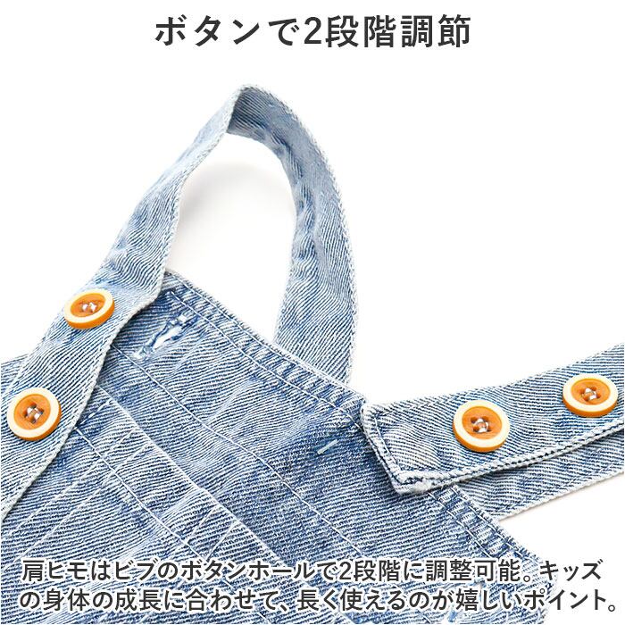 ・肩ヒモはビブのボタンホールで2段階に調整可能。キッズの身体の成長に合わせて、長く使えるのが嬉しいポイント。