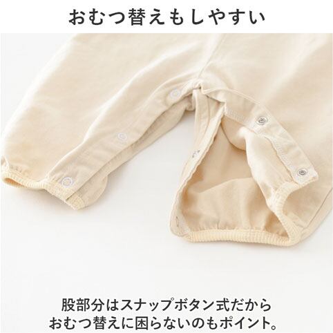 ・股部分はスナップボタン式だからおむつ替えに困らないのもポイント。