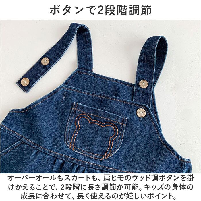 ・オーバーオールもスカートも、肩ヒモのウッド調ボタンを掛けかえることで、2段階に長さ調節が可能。キッズの身体の成長に合わせて、長く使えるのが嬉しいポイント。