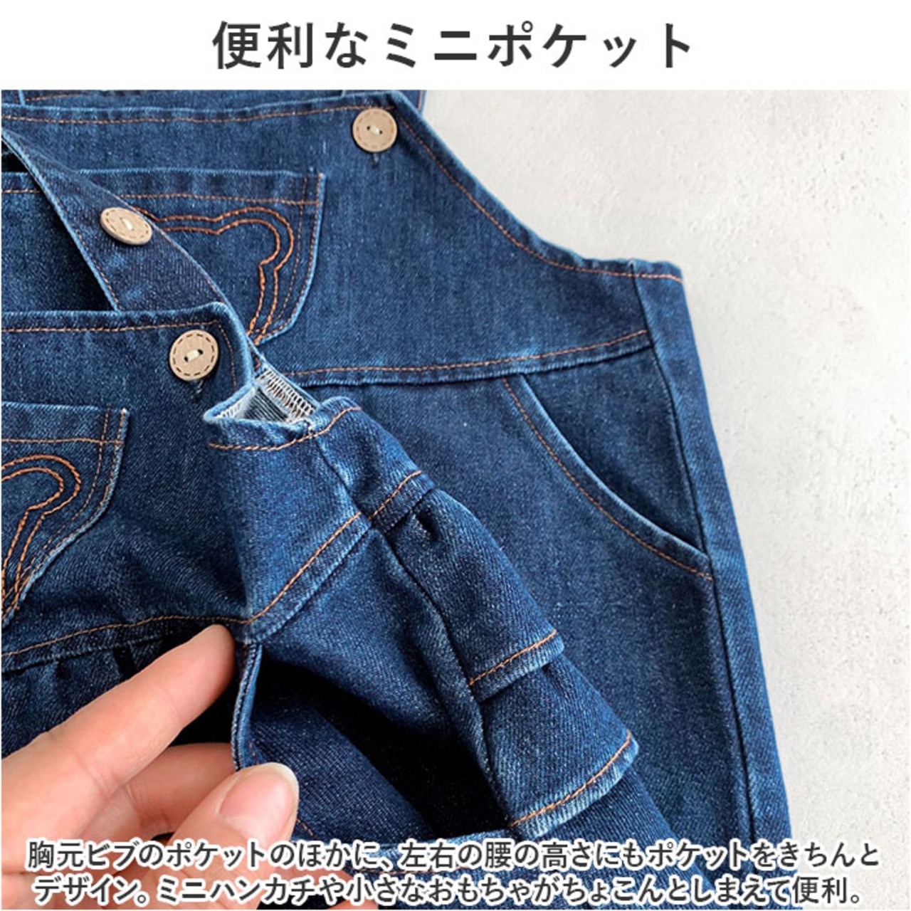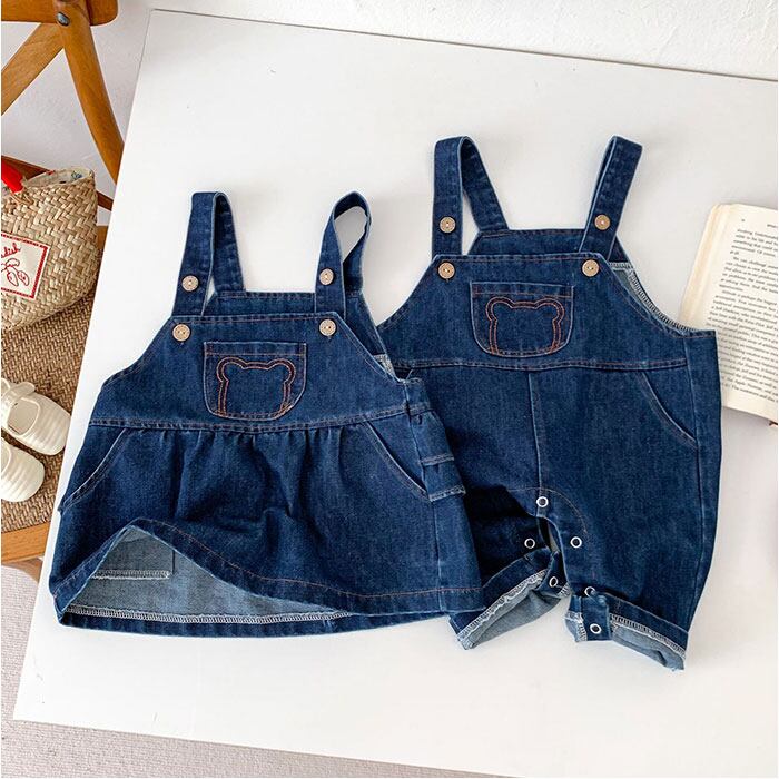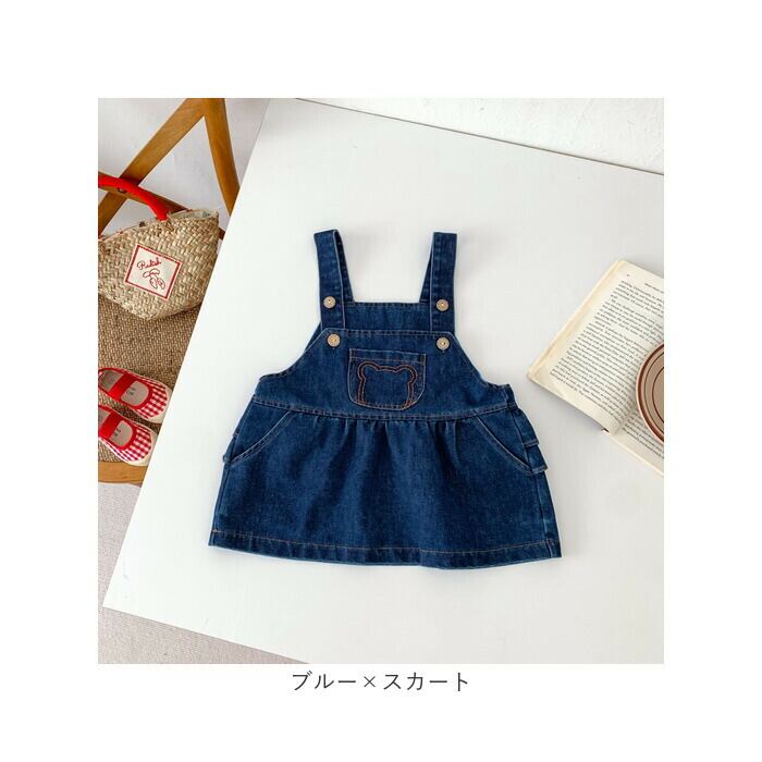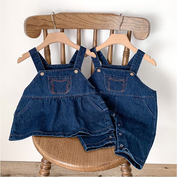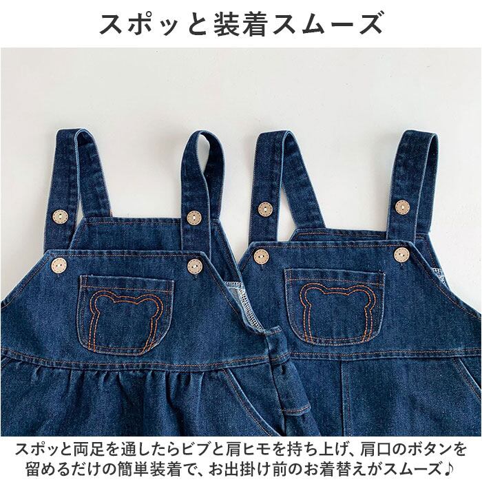 ・胸元のクマさんステッチがワンポイント!兄弟姉妹でオシャレに着こなせる「キッズ デニムオーバーオール&デニムスカート」が新登場。