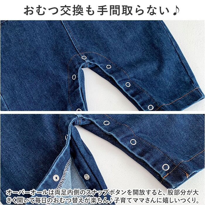 ・オーバーオールは両足内側のスナップボタンを開放すると、股部分が大きく開いて毎日のおむつ替えが楽ちん♪子育てママさんに嬉しいつくり。