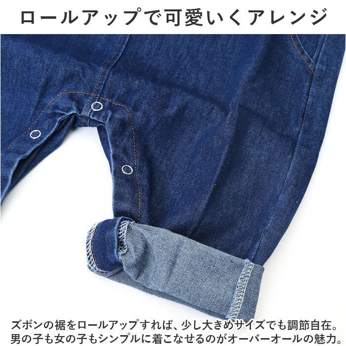 ・ズボンの裾をロールアップすれば、少し大きめサイズでも調節自在。男の子も女の子もシンプルに着こなせるのがオーバーオールの魅力。