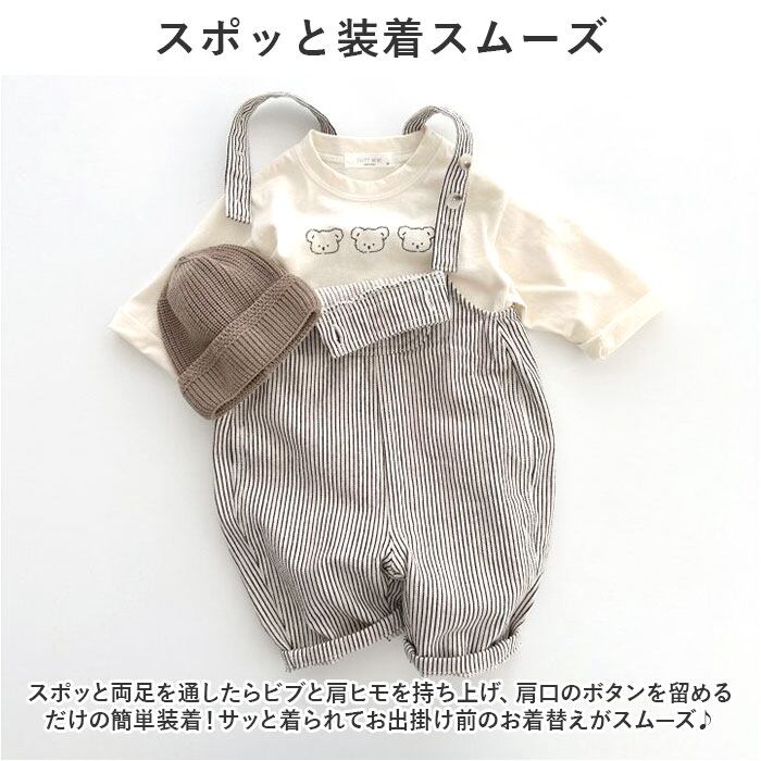 ・スポッと両足を通したらビブと肩ヒモを持ち上げ、肩口のボタンを留めるだけの簡単装着!サッと着られてお出掛け前のお着替えがスムーズ♪