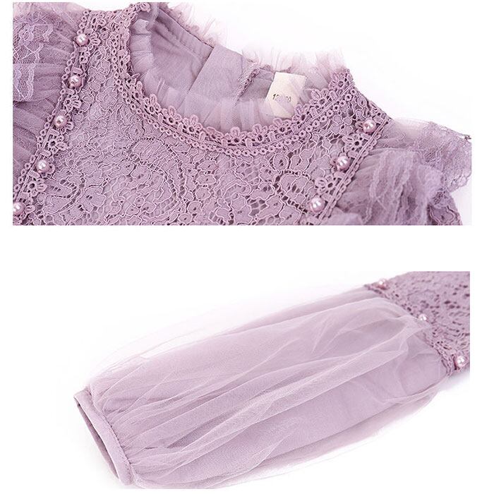 ・首元、袖口、肩からウエストにかけて繊細なレースをあしらったこだわりのデザイン。