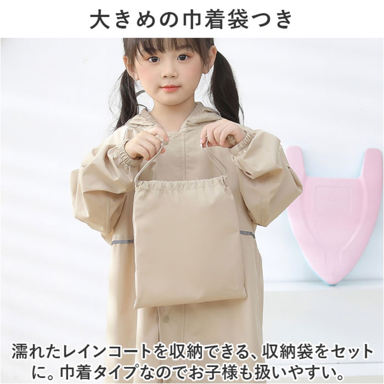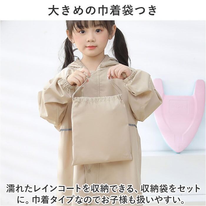 ・濡れたレインコートを収納できる、収納袋をセットに。巾着タイプなのでお子様も扱いやすい。