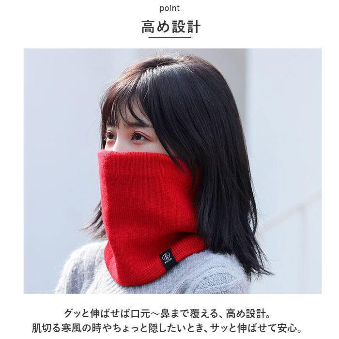 ・グッと伸ばせば口元~鼻まで覆える、高め設計。肌切る寒風の時やちょっと隠したいとき、サッと伸ばせて安心。