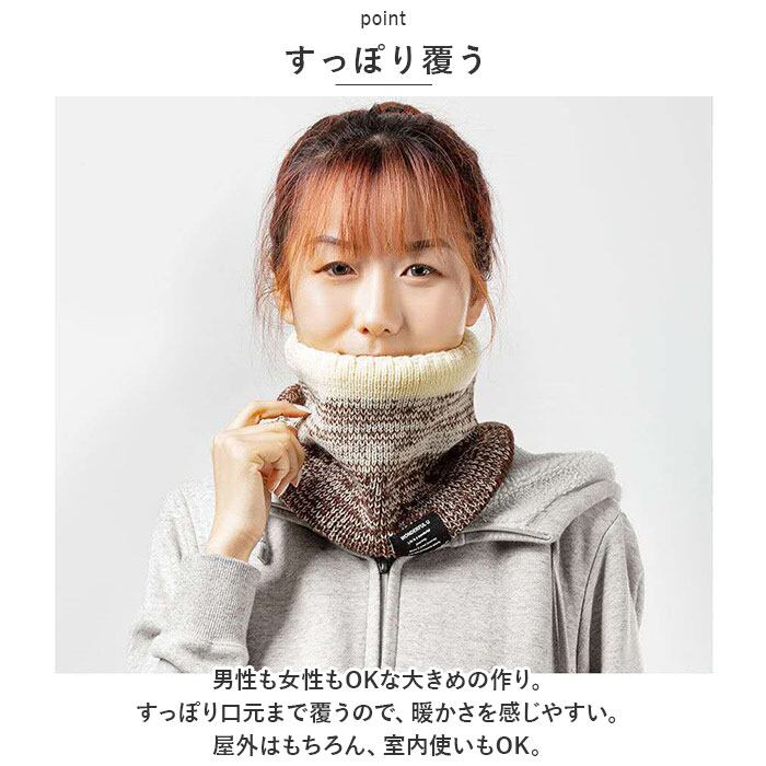 ・男性も女性もOKな大きめの作り。すっぽり口元まで覆うので、暖かさを感じやすい。屋外はもちろん、室内使いもOK。