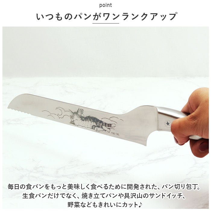 ・毎日の食パンをもっと美味しく食べるために開発された、パン切り包丁。生食パンだけでなく、焼き立てパンや具沢山のサンドイッチ、野菜などもきれいにカット♪