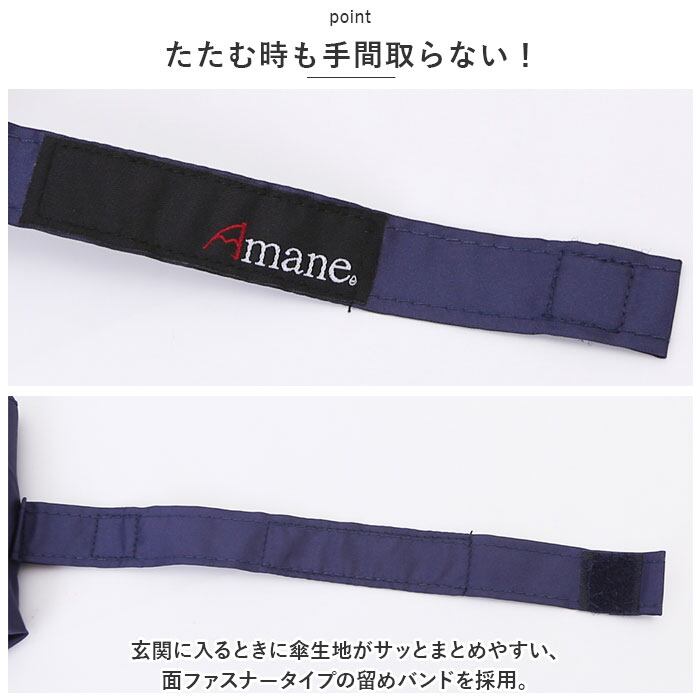 ・玄関に入るときに傘生地がサッとまとめやすい、面ファスナータイプの留めバンドを採用。